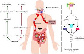 This review explores the impact of gut microbiota dysbiosis on thyroid hormone metabolism and its potential association with thyroid cancer. The analysis highlights specific bacterial genera linked to thyroid dysfunction, the role of gut microbiota in iodine absorption, and mechanisms connecting dysbiosis with thyroid disorders such as hypothyroidism, hyperthyroidism, Hashimoto’s thyroiditis, and Graves’ disease. Additionally, it examines the potential of gut microbiota as a biomarker for diagnosis and personalized treatment, as well as the prospect of probiotics and microbiota-targeted treatments.
