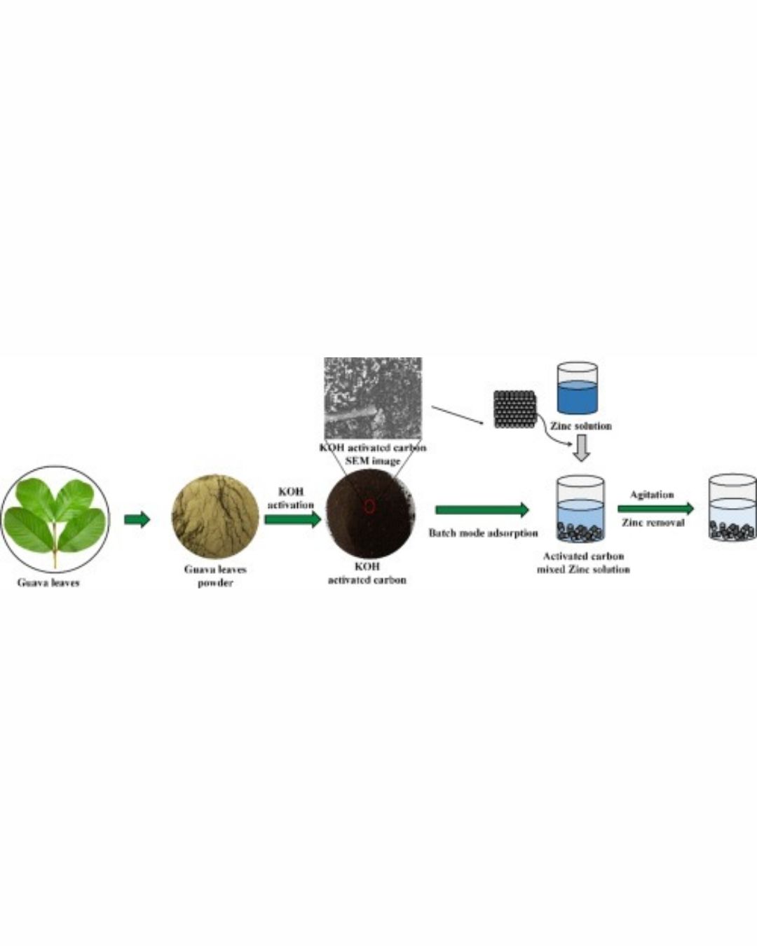Significant Findings: The research uncovers essential findings regarding the efficacy of KOH treated guava leaves as an adsorbent for zinc ions. Optimum conditions are pH 3 are identified, an adsorbent dosage of 100 mg/L, and an equilibrium period of 20 min, resulting in peak efficiency of the adsorption process. The study reveals an adsorption capacity of 14.5 mg/g for the studied metal, emphasizing the potential of KOH treated guava leaves as an efficient adsorbent for zinc ions.