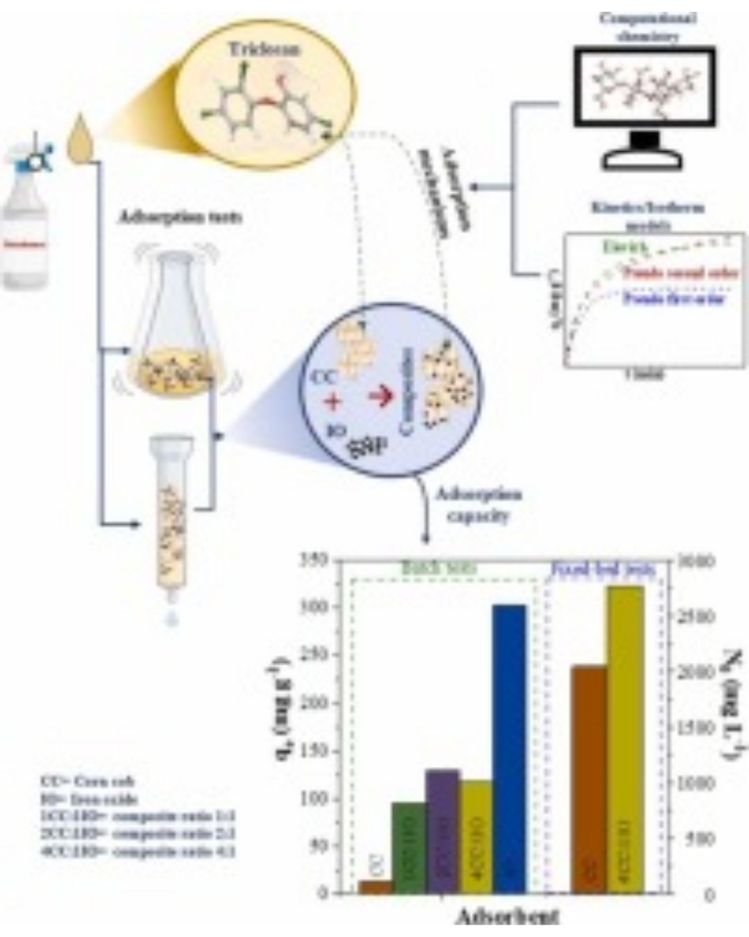 Triclosan, a lipophilic contaminant and endocrine disruptor, is widely detected in industrial, pharmaceutical, and domestic wastewaters. Organic residues impregnated with nanoparticles could be efficient adsorbents for such contaminants. This study evaluated the efficiency of corn cobs (CC), iron oxide (IO), and their magnetic composites in removing triclosan (30 mg L−1) using batch and fixed-bed column tests. Adsorbents were characterized by analytical (ASTM standards), instrumental (microscopy, spectroscopy, BET, X-ray diffraction), and computational methods. Batch tests analyzed CC/IO/composite doses (0.001–2.5 g L−1), contact times (2.5–60 min), and CC ratios (1:1, 2:1, 4:1). Results fit kinetic and isothermal models. Fixed-bed columns used CC and 4CC:1IO (most efficient). CC contained ∼94.2 % lignocellulosic material, an irregular surface with 0.4 m² g−1, and functional groups (OH, C[dbnd]O, C-O-H). IOs (∼15 nm) had a surface area of 66.3 m²/g, while composites ranged from 1.4 to 2.2 m² g−1. Optimal doses were 2.0 g L−1 for CC and 3.75–25-fold for IO/composites, removing 84.7–94.1 % triclosan within 40–60 min. Data fit the pseudo-second order model (R² = 0.89–0.99) and isotherms aligned with Langmuir and Sips models (R² = 0.97–0.99). In fixed-bed columns, CC and 4CC:1IO reached saturation at 700 and 1250 min, respectively, fitting the Bohart-Adams model (R² = 0.93–0.98). Computational chemistry elucidated triclosan removal mechanisms related to its lipophilicity, solubility, and reactive lignocellulosic sites. CC and their composites are effective, sustainable, and low-cost alternatives for removing triclosan and other lipophilic emerging contaminants, with potential for broader water treatment applications. This study evaluated the adsorption capacity of the materials for triclosan removal, incorporating kinetic models, breakthrough curves, and computational simulations to understand the removal mechanisms.