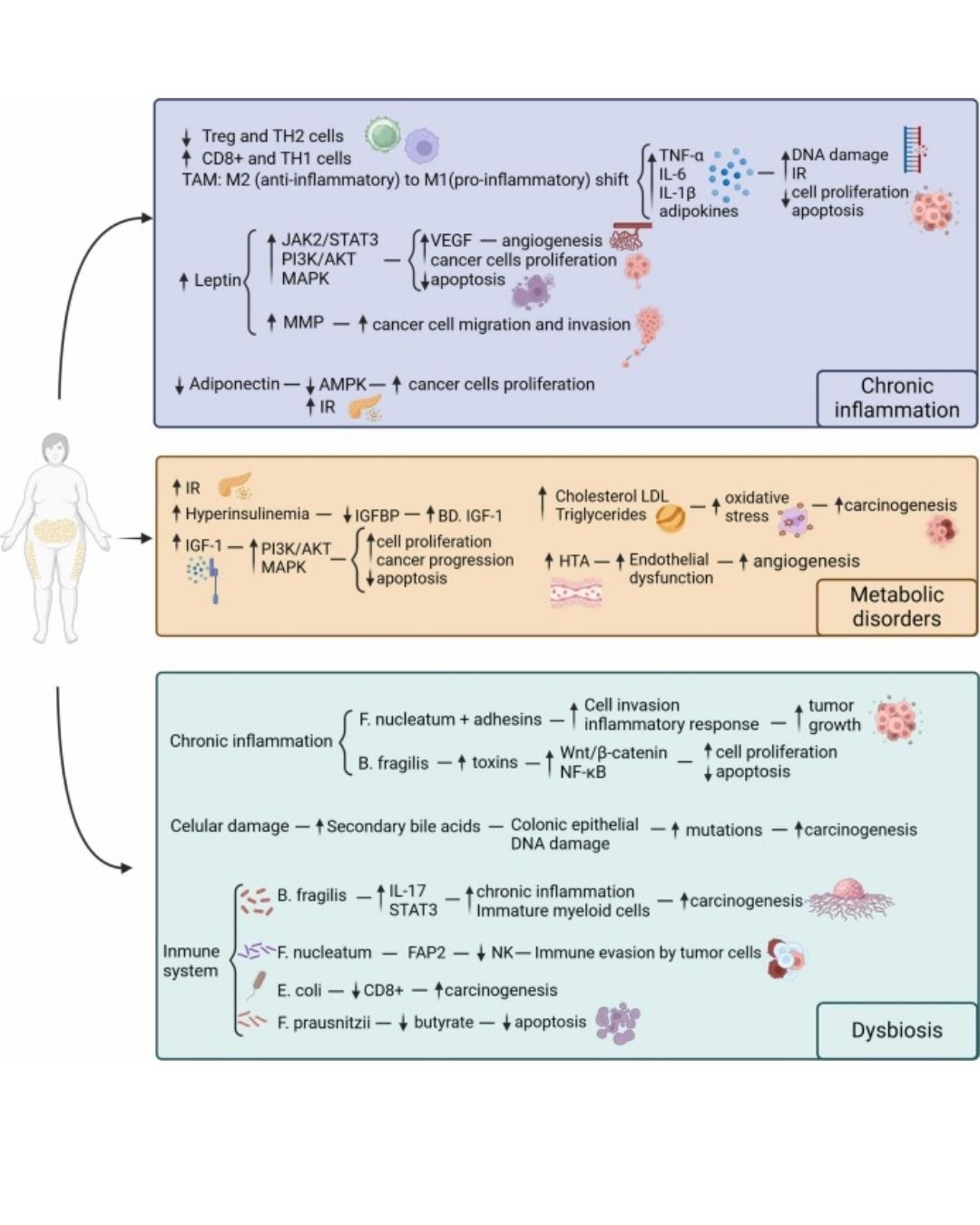 This narrative review explores the influence of obesity on colorectal cancer, focusing on obesity-related factors, including chronic inflammation, metabolic dysregulation, and gut microbiota imbalance, which collectively create a pro-carcinogenic environment that increases colorectal cancer risk and complicates treatment outcomes. The findings indicate that obesity not only accelerates tumor progression but also presents challenges in colorectal cancer treatment, such as higher rates of surgical complications due to excess adipose tissue and altered pharmacokinetics that can reduce chemotherapy efficacy. Nutritional and lifestyle interventions, particularly weight management and anti-inflammatory nutritional therapies, are highlighted as effective strategies to reduce colorectal cancer risk and support treatment in patients with obesity. The study emphasizes the importance of personalized colorectal cancer treatment approaches for individuals with obesity and calls for public health policies targeting obesity prevention, which could significantly decrease colorectal cancer incidence and healthcare burdens associated with this high-risk population.