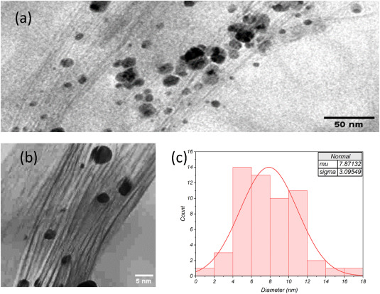 Then, the NiONP/SWCNT composite was evaluated for thermal stability and elemental composition via thermogravimetric analysis (TGA) and energy-dispersive X-ray spectroscopy. Both field emission scanning electron microscopy and high-resolution transmission electron microscopy confirmed the successful decoration of NiONPs (particle size <20 nm, mean value of 7.87 ± 3.02 nm) on the SWCNTs. Fourier-transform infrared spectroscopy revealed characteristic peaks corresponding to NiO at 644 cm−1 as IR-active modes induced by NiO–SWCNT and Raman spectroscopy further verified the chemical bonding between NiONPs and SWCNTs.