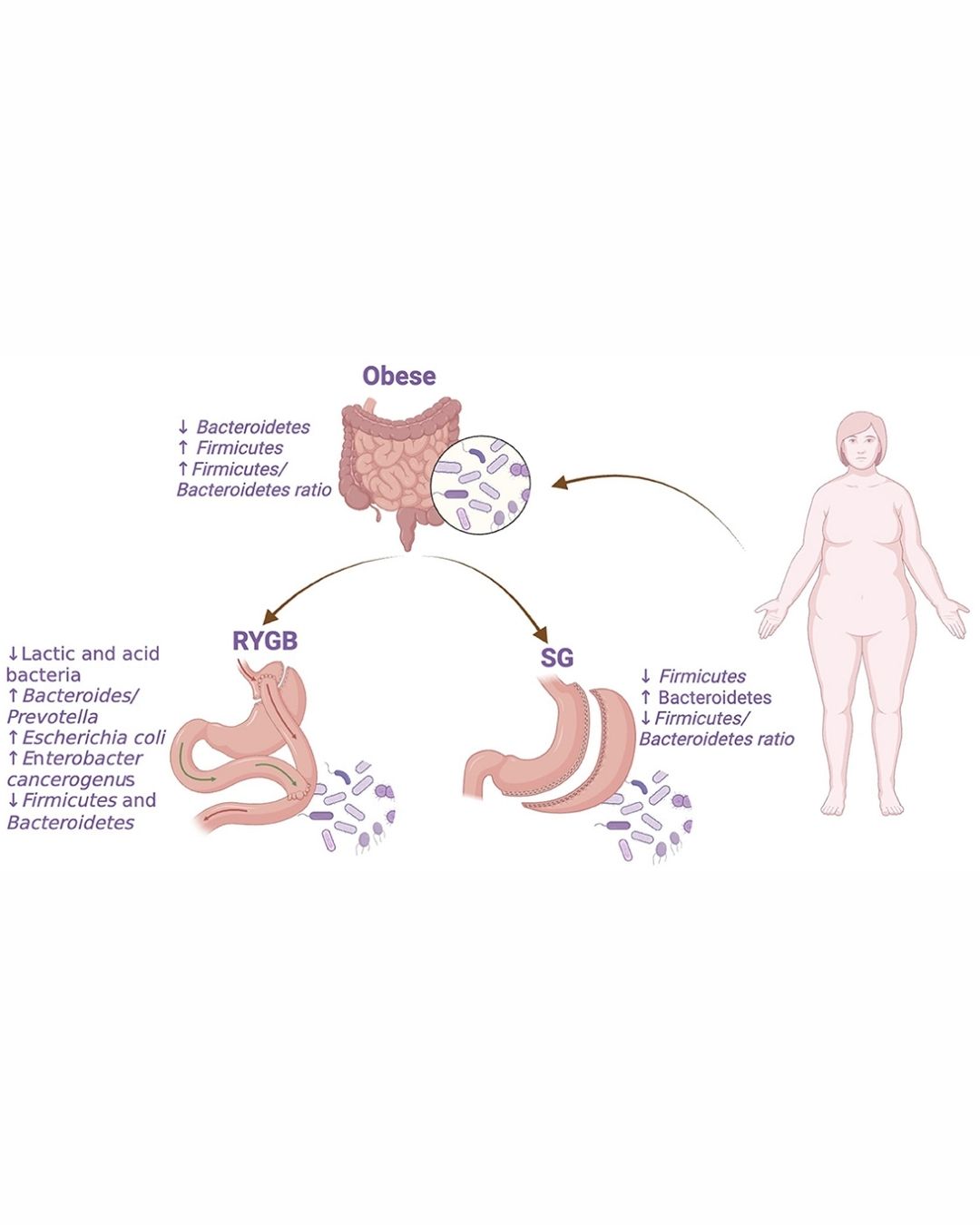 RYGB and SG are the most prevalent procedures globally, inducing gut microbiota changes that influence microbial diversity and abundance. Post-surgery, alterations in bacterial communities occur, such as the increased of <jats:italic>Escherichia coli inversely correlated with fat mass and leptin levels. During digestion, microbiota produce physiologically active compounds like bile acids (Bas) and short-chain fatty acids (SCFAs). SCFAs, derived by microbial fermentation, influence appetite, energy metabolism, and obesity-related pathways. Bas, altered by surgery, modulate glucose metabolism and insulin sensitivity.