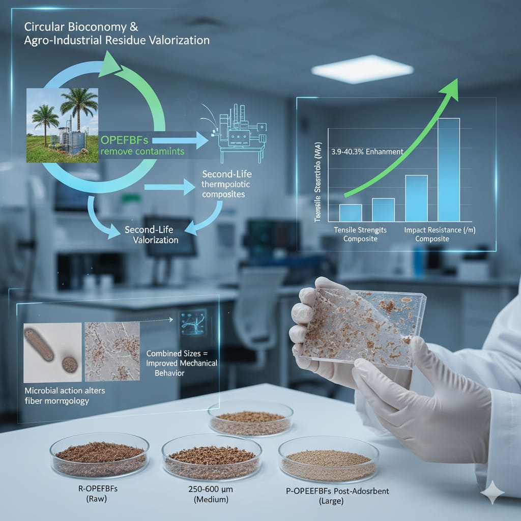 From this perspective, second-life valorization (viz., thermoplastic composites) has been explored for agro-industrial waste (viz., oil palm empty fruit bunch fibers, OPEFBFs) that has already been used previously in other circular applications (viz., the removal of domestic wastewater contaminants).