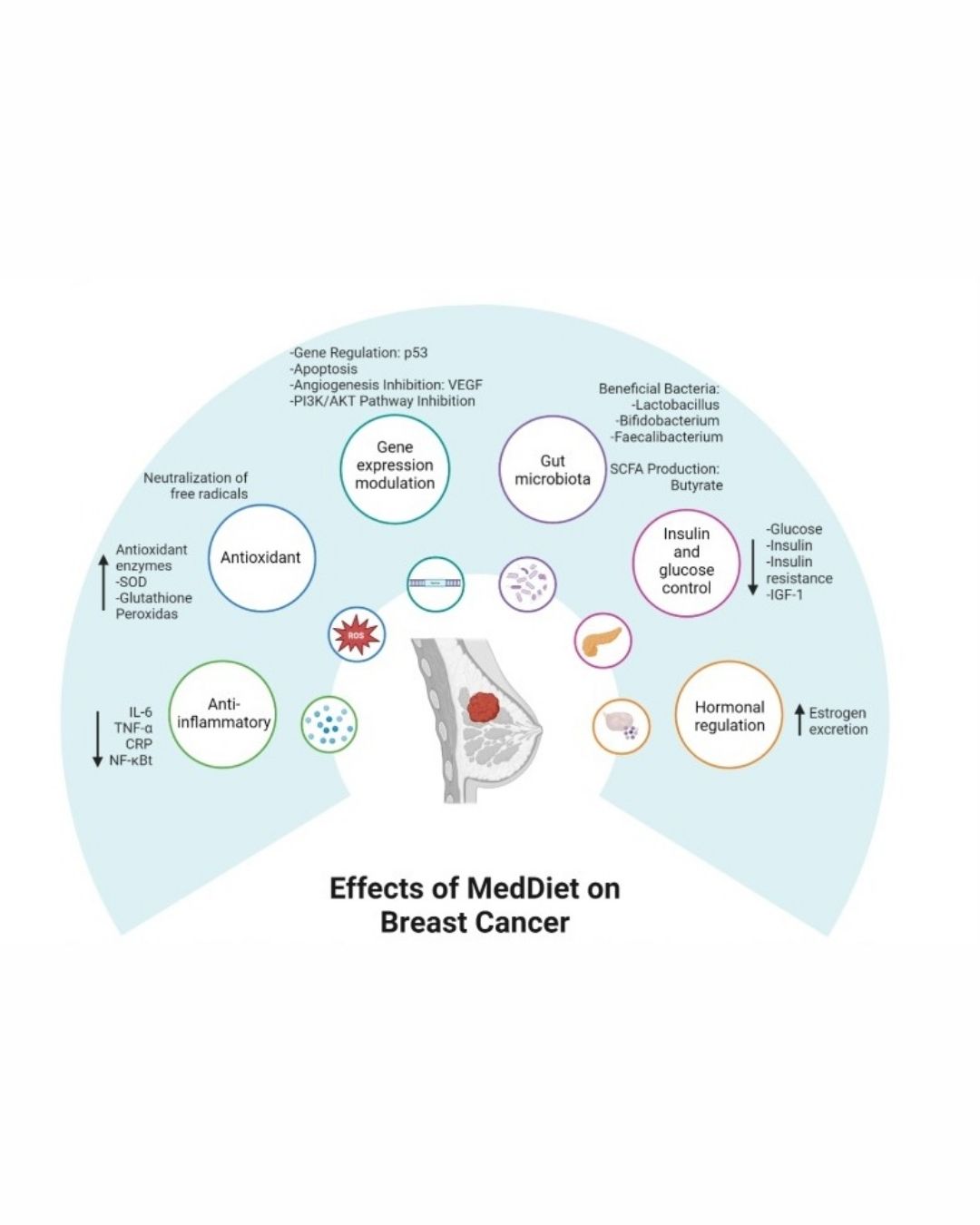 The mediterranean diet has anti-inflammatory and antioxidant effects, may influence gene regulation, and produce hormonal and intestinal microbiota changes, resulting in improved quality of life for breast cancer patients by alleviating symptoms such as pain, inflammation, and reducing the risk and mortality from this disease. Evidence suggests that greater adherence to the mediterranean diet reduces the risk of breast cancer, as well as an improvement in patients' quality of life and mortality.