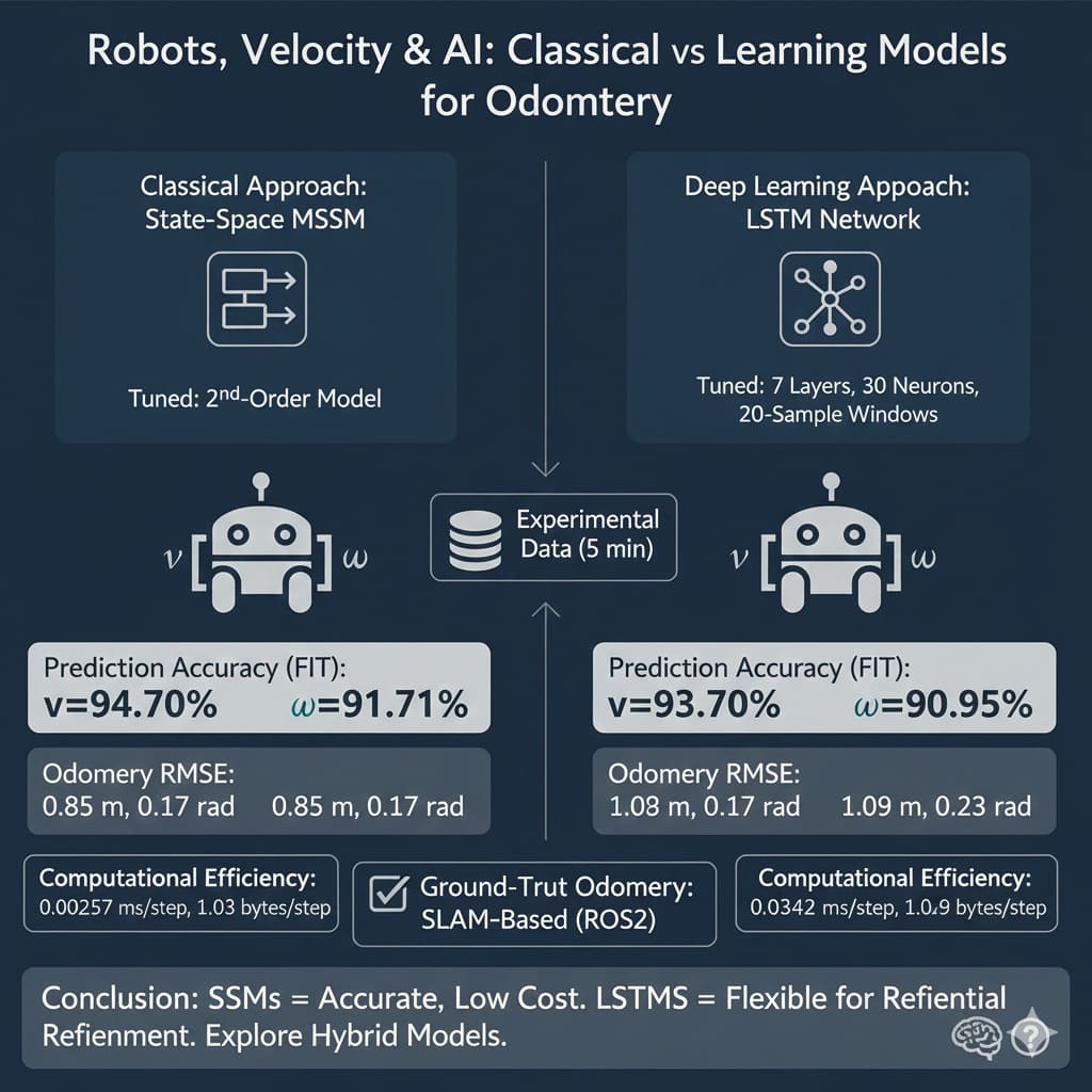 This paper compares two multivariate modeling approaches for a differential drive robot: a classical SSM and an LSTM-based recurrent neural network. Both models predict the robot’s linear (v) and angular (ω) velocities using experimental data from a five-minute navigation sequence.
