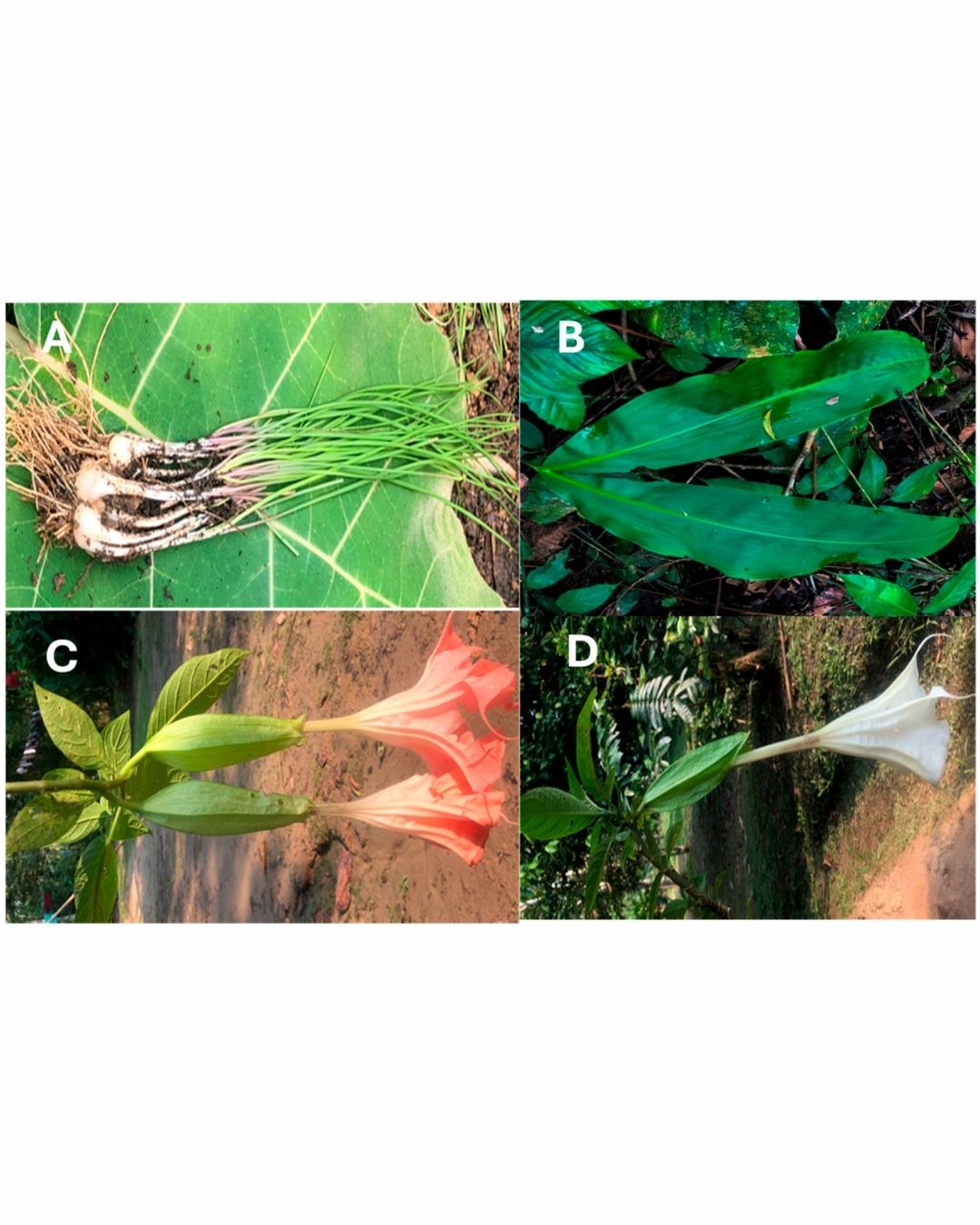 The Amazon region is home to a remarkable diversity of plant species that are used in traditional medicine and cuisine. This study aimed to evaluate the functional, antioxidant, and antimicrobial properties of the leaves of Allium schoenoprasum, Brugmansia candida (white and pink), and Cyclanthemum bipartitum. Bioactive compounds (L-ascorbic acid, organic acids, carotenoids, phenolic compounds, and chlorophylls) were quantified using liquid chromatography. The ABTS and DPPH methods were used to assess the antioxidant capacity. Additionally, the antimicrobial activity against Escherichia coli, Staphylococcus aureus, Pseudomonas aeruginosa, Streptococcus mutans, Candida albicans, and Candida tropicalis was evaluated. The results revealed a high content of L-ascorbic acid (7.6 mg/100 g dry weight) and total carotenoids (509.0 mg/100 g dry weight), as well as high antioxidant capacity (4.5 mmol TE/100 g dry weight) and broad antimicrobial activity in Brugmansia candida ‘pink’. The White variety had the highest concentration of total chlorophylls (1742.8 mg/100 g DW), Cyclanthemum bipartitum had the highest total organic acid content (2814.5 mg/100 g DW), and Allium schoenoprasum had the highest concentration of total phenolic compounds (11,351.6 mg/100 g DW). These results constitute a starting point for future research, emphasizing the potential health risks that certain species may pose.