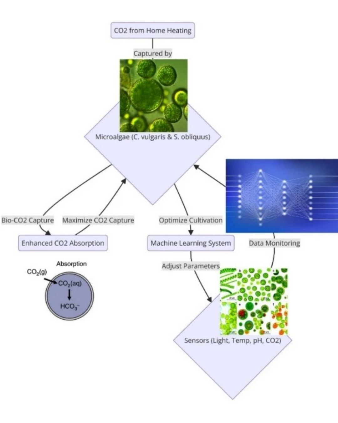 The study demonstrated that Chlorella vulgaris and Scenedesmus obliquus, cultivated under controlled conditions, significantly improved absorption rates by 50% and 80%, respectively, showcasing their potential in residential heating systems. Post-cultivation, the extracted lipids were effectively utilized for biodiesel production. The RL models achieved high predictive accuracy, with R2 values of 0.98 for temperature and 0.95 for oxygen levels, confirming their effectiveness in system regulation.