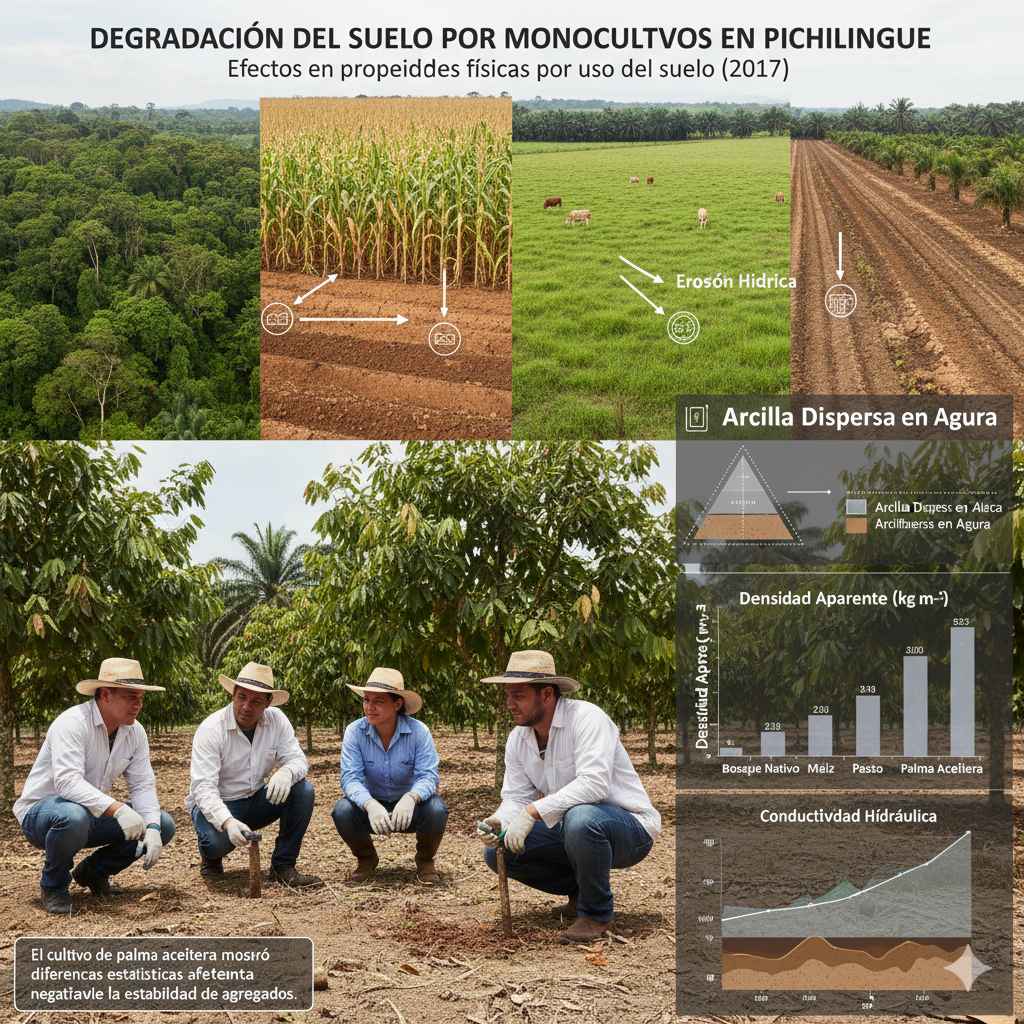 Los sistemas de monocultivo degradan el suelo afectando sus propiedades físicas y químicas, y su regeneración es muy lenta. Con el objetivo de conocer cambios en las propiedades físicas del suelo de la Estación Experimental Tropical Pichilingue, por efecto del uso, se empleó un diseño de bloques completos al azar con tres repeticiones, en los suelos de bosque nativo y monocultivos de maíz (30 años), cacao (50 años), pasto (4 años) y palma aceitera (26 años) en diferentes profundidades cada 0,10 m hasta los 0,6 m. Se evaluaron propiedades físicas como conductividad hidráulica, densidad aparente, densidad real, porosidad total, porosidad de aireación, humedad volumétrica, textura, arcilla dispersa en agua, grado de floculación, materia orgánica e índice de materia orgánica/limo+arcilla. Los datos fueron analizados estadísticamente y se realizó la prueba de Tuckey (P≤0,05). Se encontró que maíz, palma aceitera y pasto provocaron incrementos estadísticos significativos en la densidad aparente del suelo sin llegar a sobrepasar los niveles críticos de 1390 kg m-3 y no significativos en reducción de la porosidad total en la profundidad de 0,1-0,2 m. También, hubo alta concentración de arcillas en las primeras profundidades de los suelos cultivados, que provocó susceptibilidad a los procesos de erosión hídrica, concluyendo que el suelo bajo cultivo de palma aceitera mostró mayores diferencias estadísticas debido a la textura, afectando negativamente la densidad aparente del suelo, conductividad hidráulica, arcilla dispersa en agua, que en suma contribuyen a disminuir la estabilidad de agregados.