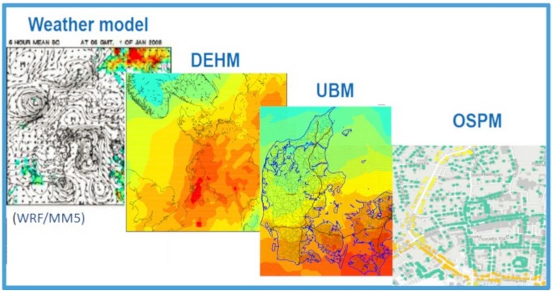 The modelling framework combines coupled chemistry–transport models (DEHM/UBM/OSPM) with input from the Green Mobility Model and GPS-based vehicle speed data. Model outputs were evaluated against observations from the Danish Air Quality Monitoring Programme, showing strong agreement for NO2, PM2.5, PM10, and BC, but notable overestimation of PNC background levels and underestimation of street contributions.