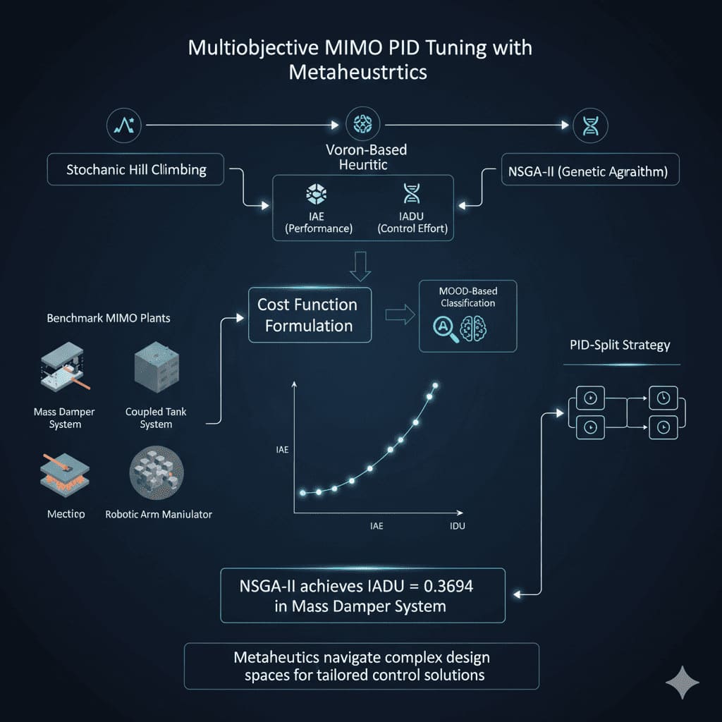 This paper presents a comprehensive methodology for the multiobjective tuning of MIMO proportional integral derivative (PID) controllers using advanced metaheuristic strategies. The proposed approach formulates a cost function based on two conflicting performance criteria—the integral of absolute error (IAE) and the integral of absolute derivative of control (IADU)—to explore the trade-off between tracking performance and control effort systematically.